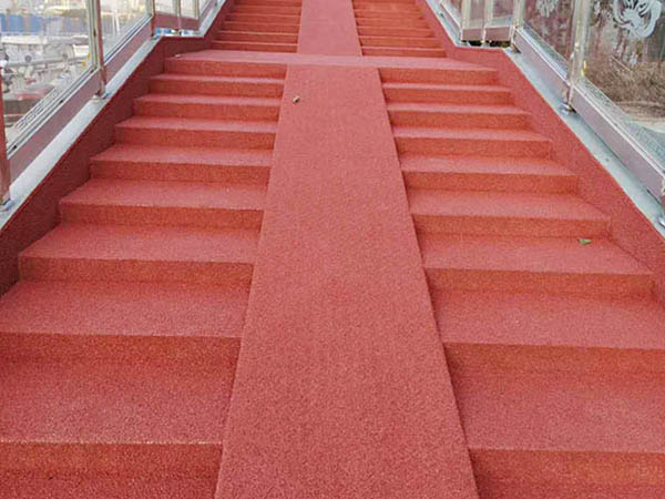 6.將符合要求的干凈彩色防滑骨料均勻地涂在膠粘劑上,使膠粘劑完全覆蓋骨料,兩者充分結合,骨料密實光滑。小心不要弄平或溢出。及時取下膠帶,以確保彩色路面的邊緣沒有損壞。如果路面損壞,應及時使用原材料修補。